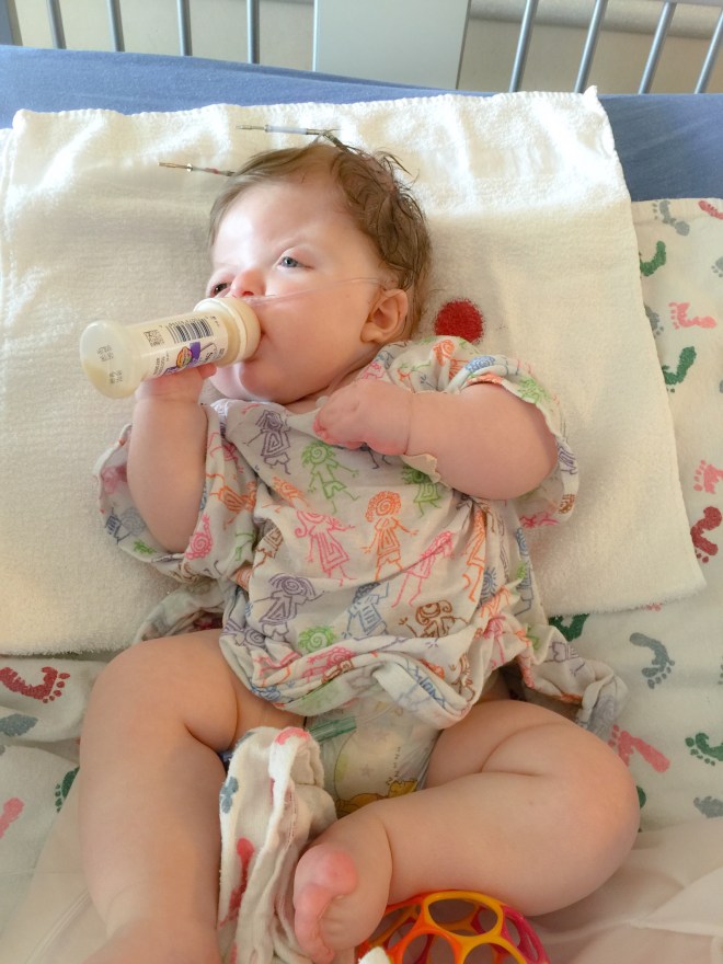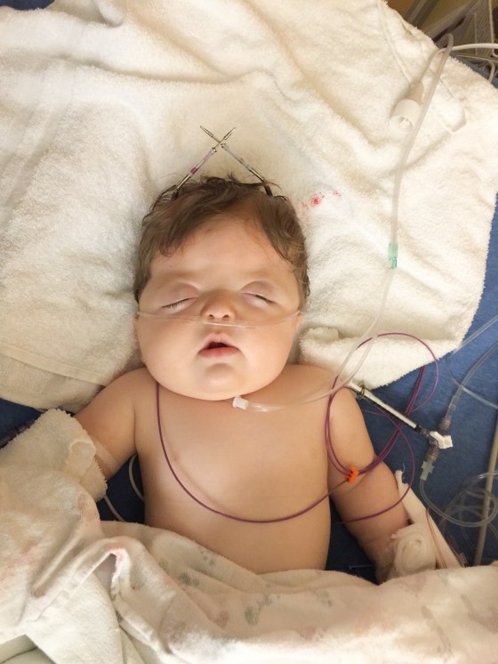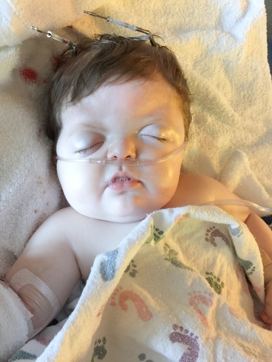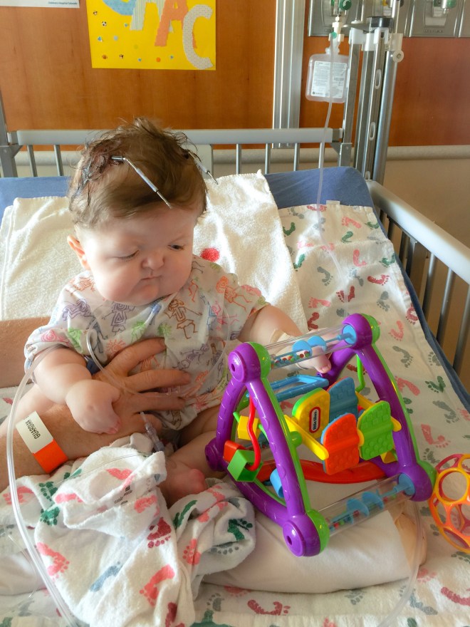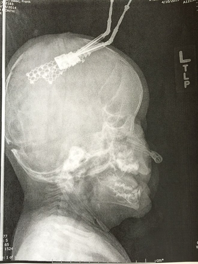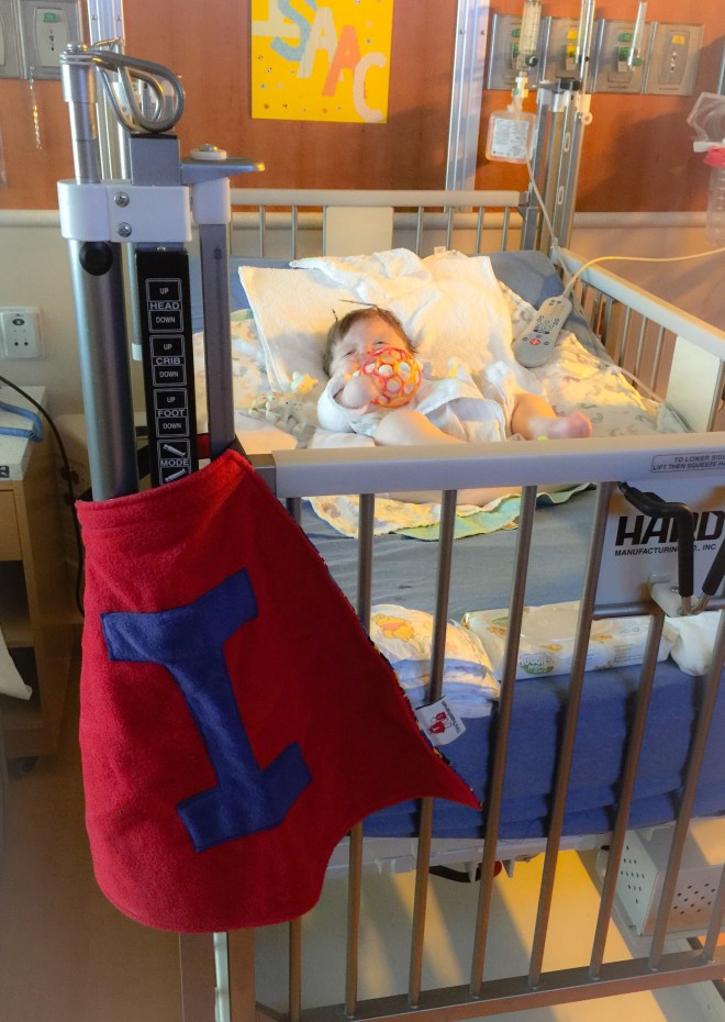 Isaac has been doing great. There was a concern a few weeks after we brought him home. Part of his incision had opened up and the surgeons were concerned that it wouldn’t heal on its own. They had contemplated going back in and closing it up and possibly taking out the plate that was in that area. They decided to give him another week to see if his body would heal up and avoid another surgery. Well, he must not want to go into surgery because the incision healed and the following week we were in they were able to remove the stitches. He does still have his Broviac Line and is still getting heavy antibiotics every night infused through the line. He will continue with the infusion antibiotics until his next surgery. He will be having surgery on his palate and his first finger release in about a month or two. We are still waiting to hear from the scheduler on a date.