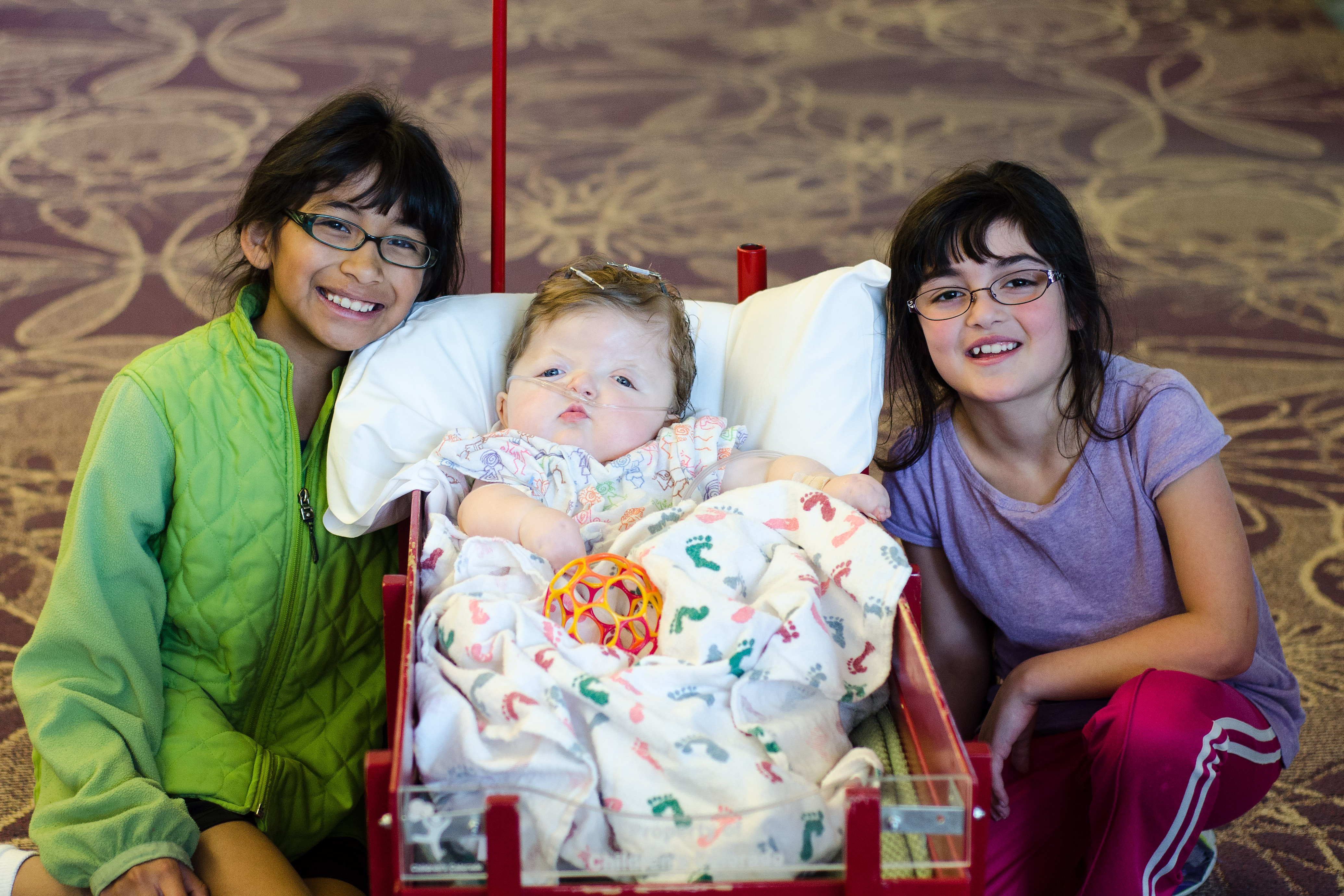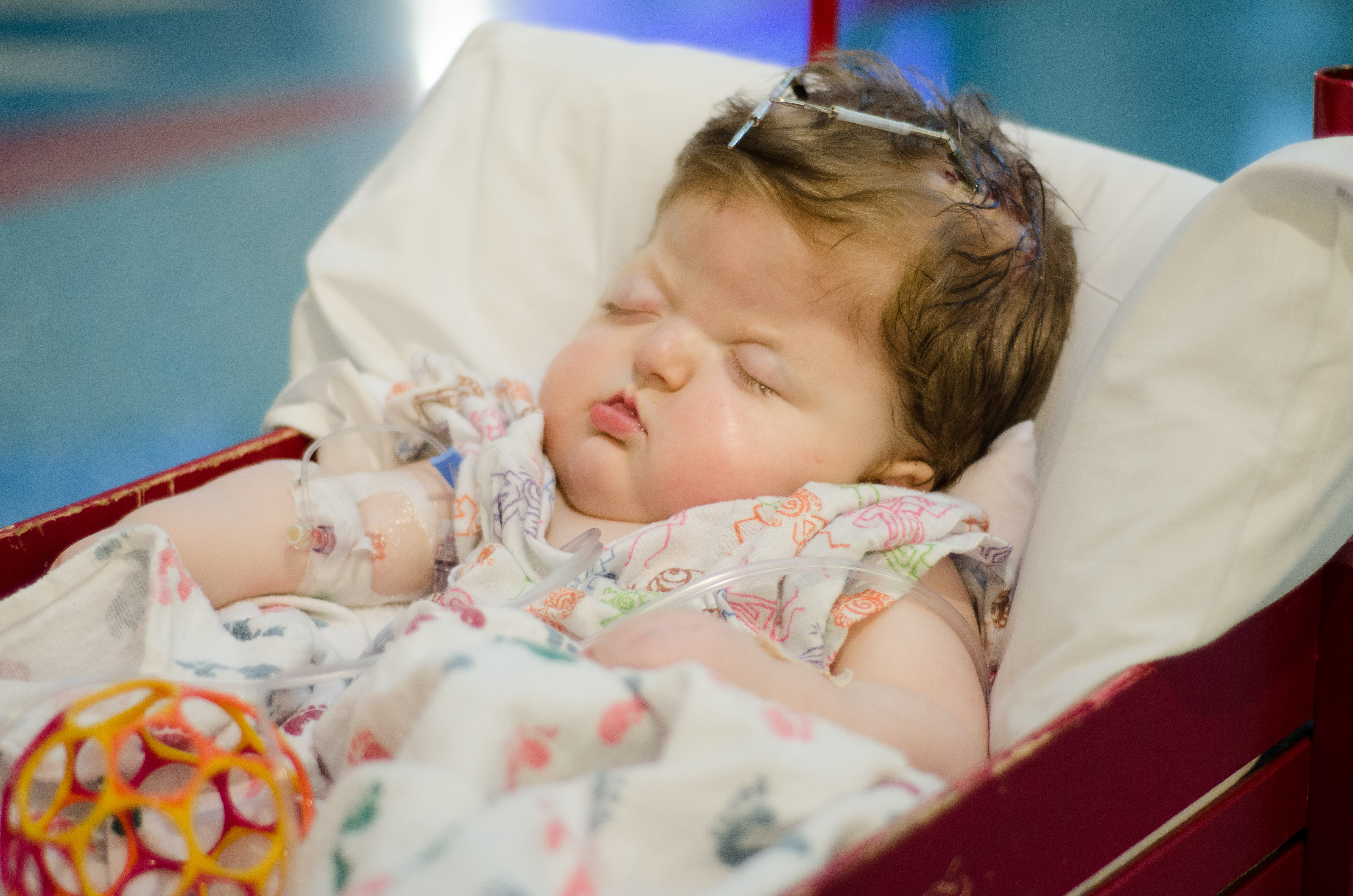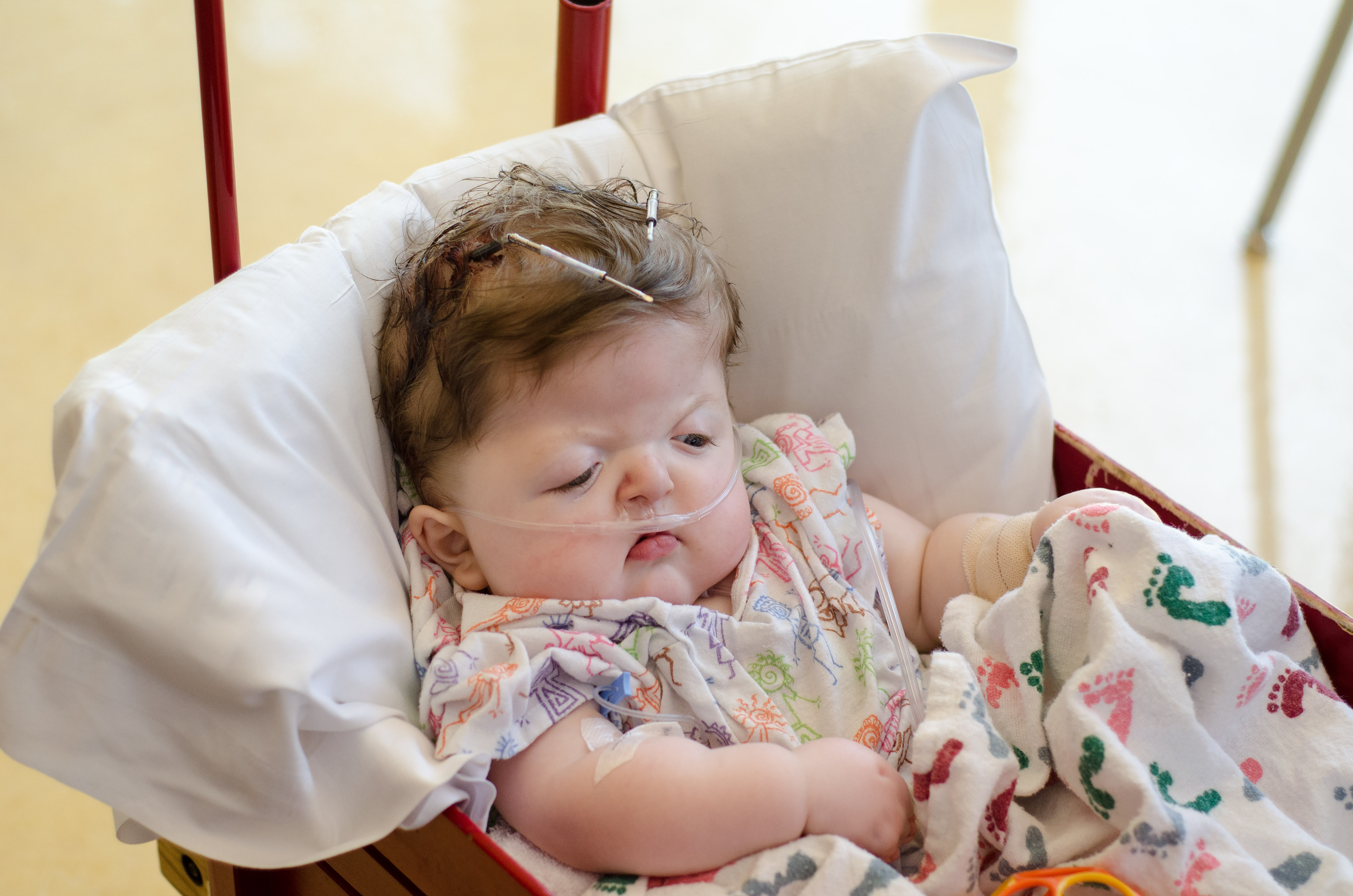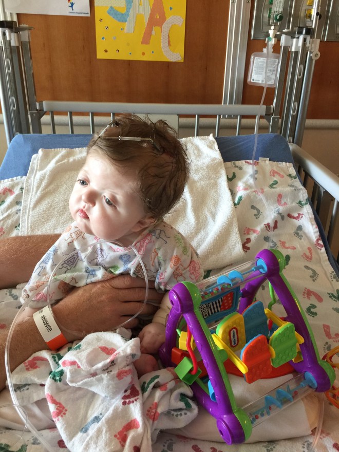 Isaac has been doing great. There was a concern a few weeks after we brought him home. Part of his incision had opened up and the surgeons were concerned that it wouldn’t heal on its own. They had contemplated going back in and closing it up and possibly taking out the plate that was in that area. They decided to give him another week to see if his body would heal up and avoid another surgery. Well, he must not want to go into surgery because the incision healed and the following week we were in they were able to remove the stitches. He does still have his Broviac Line and is still getting heavy antibiotics every night infused through the line. He will continue with the infusion antibiotics until his next surgery. He will be having surgery on his palate and his first finger release in about a month or two. We are still waiting to hear from the scheduler on a date.