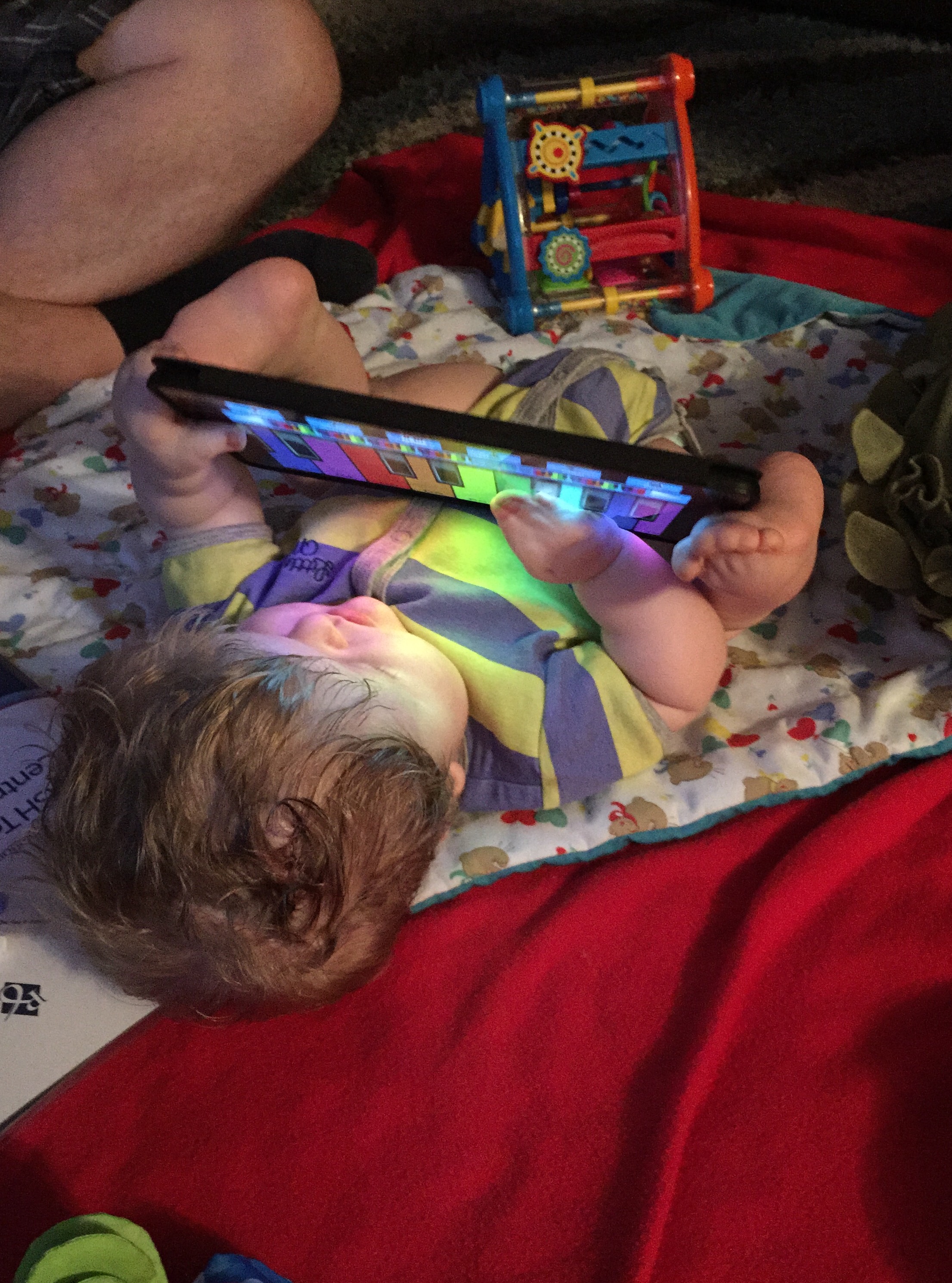 Isaac loves to play the iPad or iPhone. His favorite is to play the piano app. He is great at sitting up. He loves toys that spin. He is working on crawling. We bribe him with the iPad and he will work his way to it, in an army crawl his own style. You never realize how much you take your kids milestones for granted until you have a child that all these milestones are a BIG deal. Well, Isaac, he is a bit of a BIG deal around here.